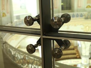 Punktgehaltene Innenverglasung unter dem Aspekt Schallschutz und Denkmalpflege mit gebo kugelgelagerte idealgelenkige Tellerhalter ZK A 70 mit zentrischer Kugel und AK A 70 mit Kugel außerhalb der Glasebene mit optimaler Toleranzausgleich und zwängungsfreie Lagerung der einzelnen Glasscheiben.